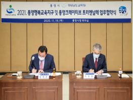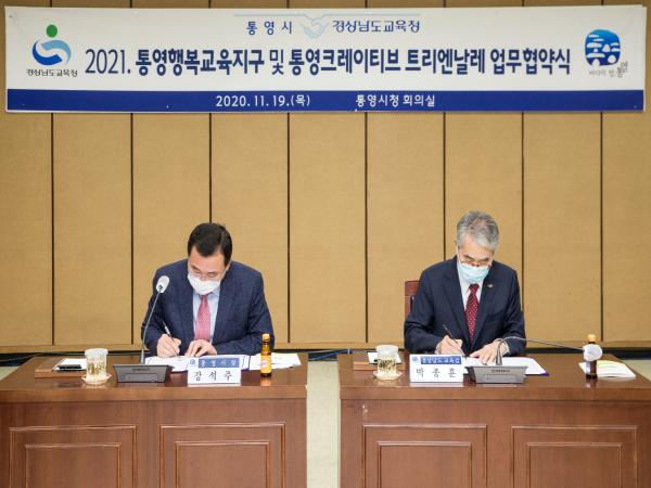 통영시와 경상남도교육청은 11월 19일 통영시청 회의실에서 통영행복교육지구 사업 및 통영크레이티브 트리엔날레 공동 추진을 위한 업무협약을 체결했다.