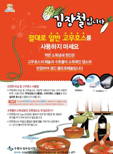 수원시 상수도사업소는 본격적인 김장철을 앞두고 수돗물 사용 시 역한 냄새의 원인이 되는 일반용 고무 용품 대신 식품 전용 무독성 용품을 사용할 것을 당부했다.