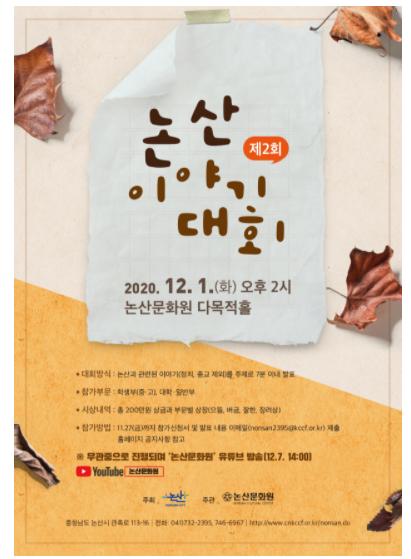 ‘논산 이야기 대회’내용은 오는 12월 7일 오후 2시부터 유튜브 ‘논산문화원’채널에서 시청가능하다.