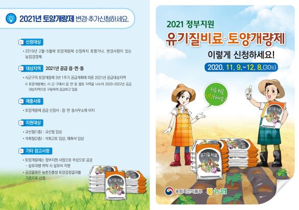 유기질비료 3종(혼합유박, 혼합유기질, 유기복합비료)과 부숙유기질비료 2종(가축분퇴비, 퇴비), 토양개량제 3종(규산질, 석회고토, 패화석)을 지원하며, 지원대상은 농업경영정보를 등록한 농업인 또는 농업법인이다.