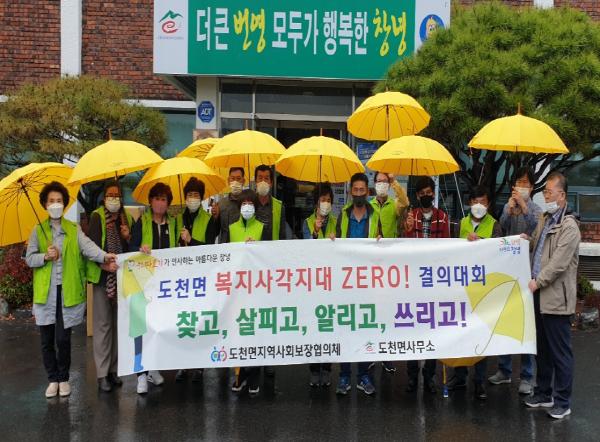복지사각지대 제로를 위한 홍보물품 노란우산을 제작하여 복지사각지대 제로화를 위한 복지사각지대 발굴 결의대회를 개최하고 민·관 협력의 인적 안전망 체계를 강화하고 복지사각지대 없는 도천면을 만들기 위해 하나된 목소리로 취약계층 발굴 실천 결의를 다짐했다.