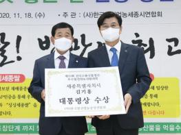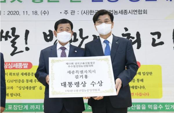 세종특별자치시 금남면의 김기홍 씨가 ㈔한국쌀전업농중앙회 주관의 ‘제23회 전국 고품질 쌀 생산 우수 쌀 전업농 선발대회’에서 금영예의 대상을 수상해 대통령상을 받았다.