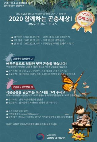 농촌진흥청 국립농업과학원은 국내 토종 곤충을 발굴 하고, 곤충산업을 육성하기 위해 2020년 ‘함께하는 곤충세상! 경진대회’를 개최한다.