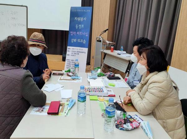 2부는 김난희 강사의 진행 아래 ‘자원봉사 동캠프답게 함께 일하는 지혜’란 주제로 지역사회 공동의 문제를 해결하기 위해 마을의 자원을 나누고 협력하는 방법에 대해 논의하는 참여형 교육으로 진행됐다.