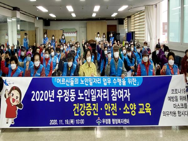 조옥임 우정동장은 “이번 안전교육이 어르신들이 건강하고 안전하게 일하시는 데에 많은 도움이 되길 바란다”며 “점점 추워지는 날씨에 어르신들의 건강을 유의해 2020년도 노인일자리 사업이 무사히 마무리될 수 있도록 협조 부탁드린다”고 말했다.